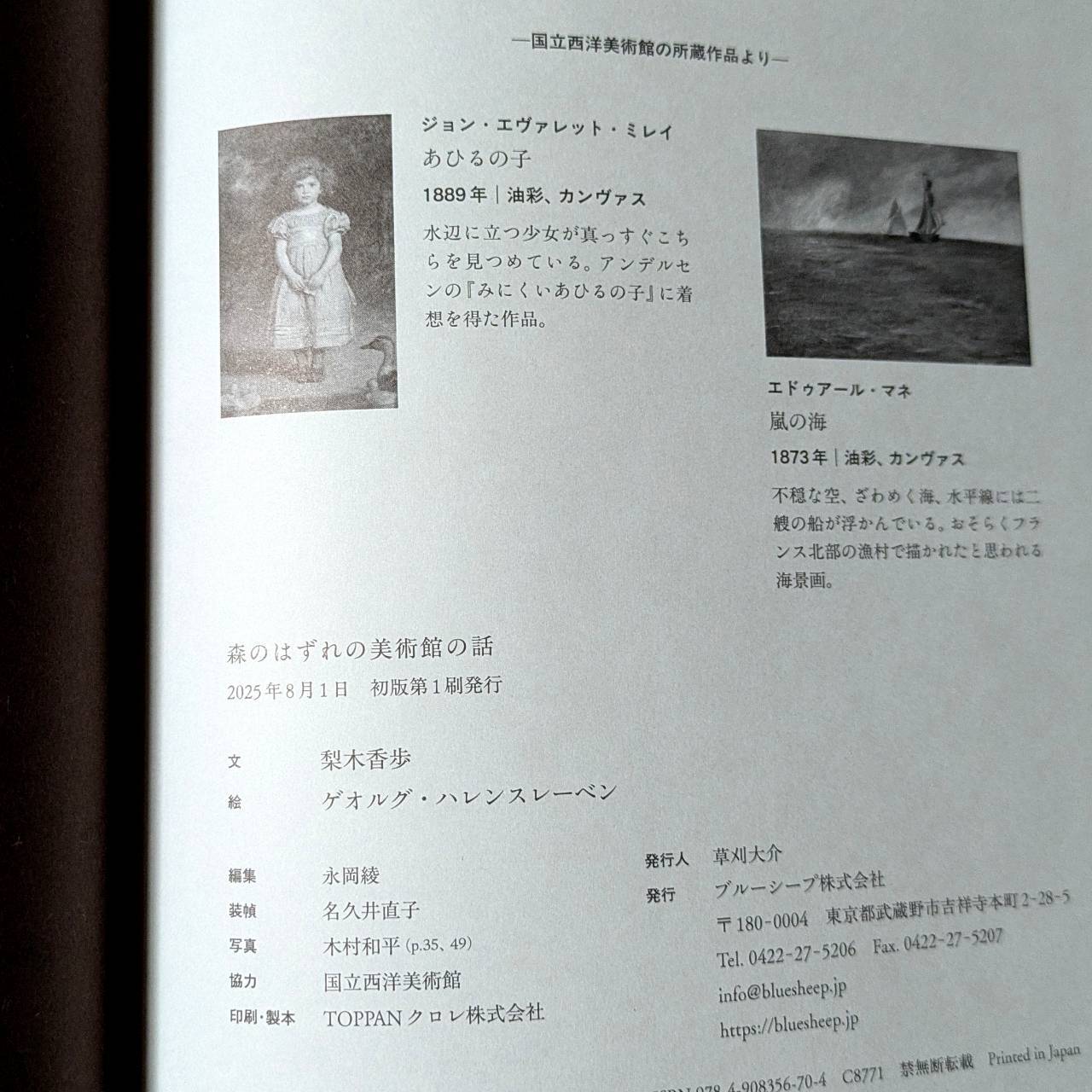 数奇な運命を辿ってやってきたコレクションは、森のはずれの美術館で「西洋のかけら」としてきらめき、そこでは“東”と“西”が静かに見つめ合っています。そんな特別な場所で、人が絵と結ばれることの喜び、そして大切なものを見出すことの幸せを、二人の名手が静かな力強さで描き出しました。美術館でゆったりと絵画と向き合う時間の豊かさを深く感じることのできる絵本です。